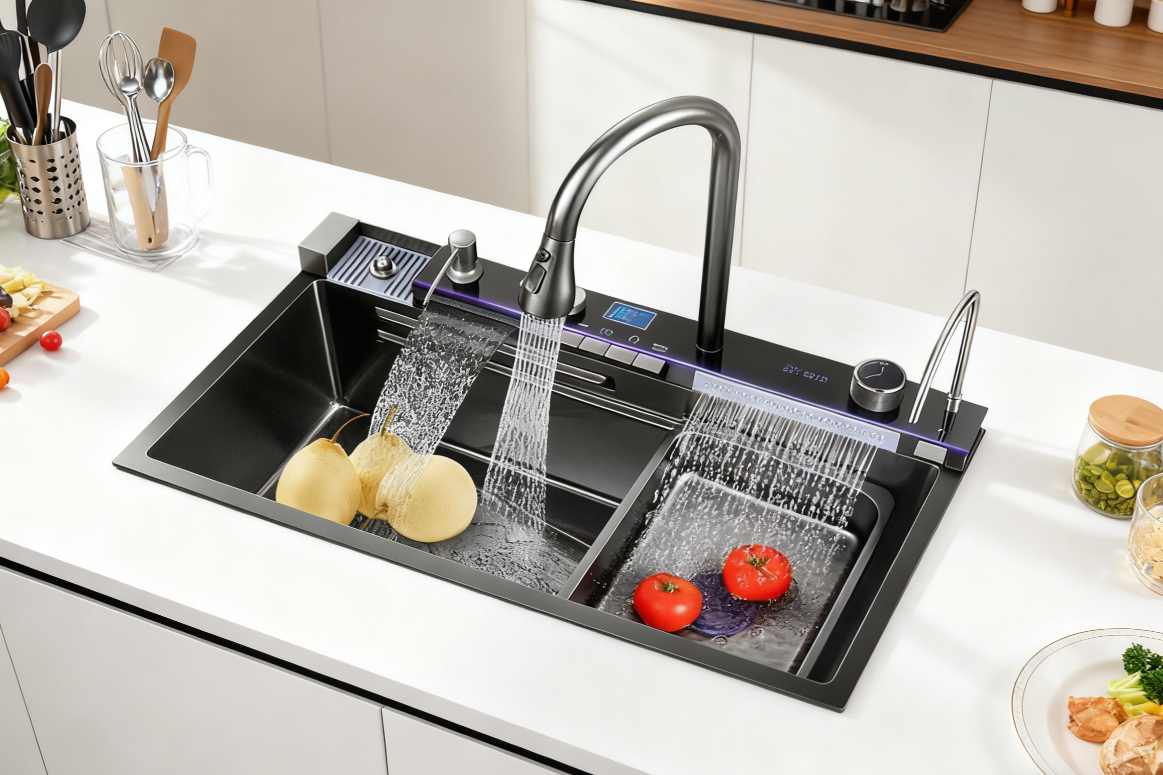Kitchen Sink with Double Waterfall & Piano Key Design Control Button
