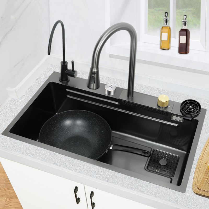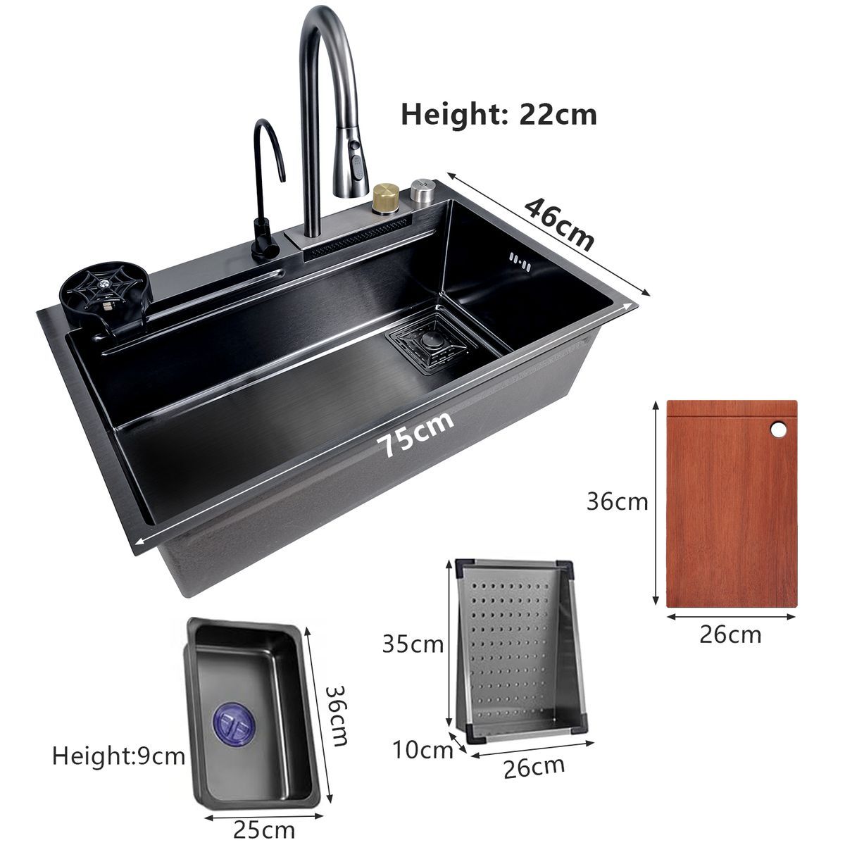 This sink comes fully loaded with a 360 pull-out faucet, waterfall mode, cup washer, soap dispenser, cutting board, drying rack, and more- everything you need for a hassle-free kitchen experience.